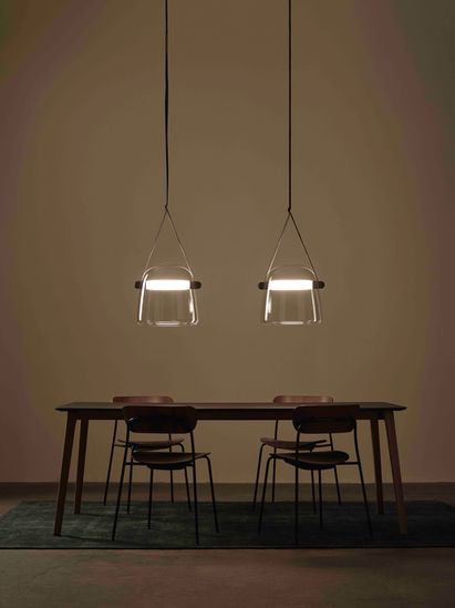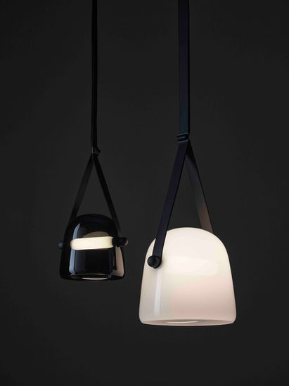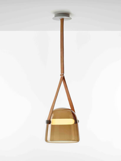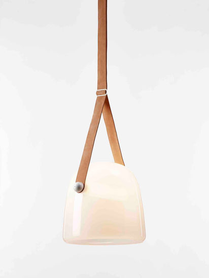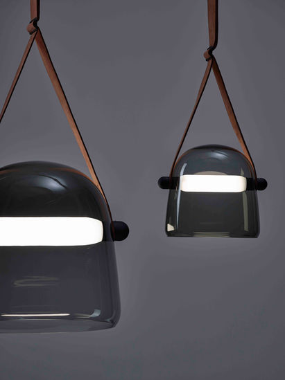 モナは「貫くフォルム」をコンセプトとしたデザインです。美しい艶を帯びた大きな手吹きガラスのシェードを、バー状の光源が貫いた大胆なこの照明は、少しスリリングで、緊張感をもたらします。金属やレザー、ガラスなど、使われているどの素材も職人たちによって妥協することなく作られたもの。その卓越した技術を間近で見るために、モナは最良の存在と言っても過言ではないでしょう。ペンダントとブラケットを展開し、サイズはS、M、Lをラインナップしています。